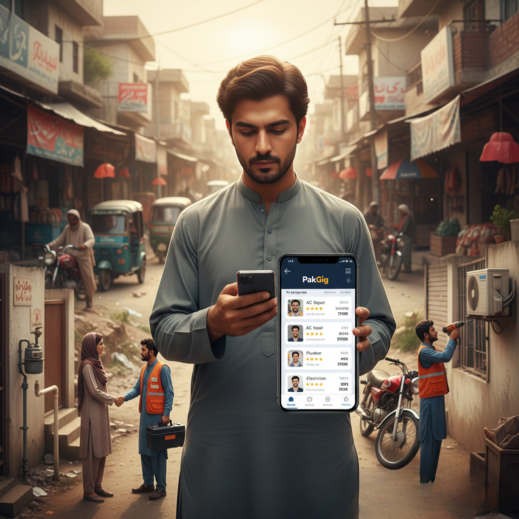 Open the PakGig website. You can choose from categories like AC Repair, Plumber, Electrician, Carpenter, or even Home Cleaning.